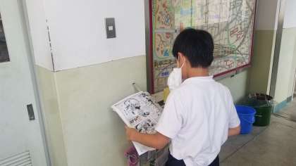 図書館開放を待っているようすです。子ども新聞やPTA主催の「読書ラリー」のポスターを熱心に見ていました。「もう30冊読んだよ。」と教えてくれる児童もいました。