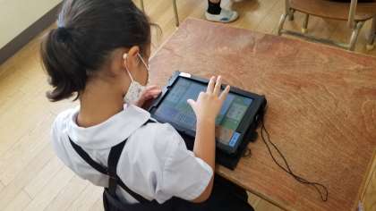 2年生の様子です。休み時間に、タブレットを活用して、「かまきり」のお絵描きをしています。テレビやプロジェクターに映し出されたカマキリの写真を参考にしていました。