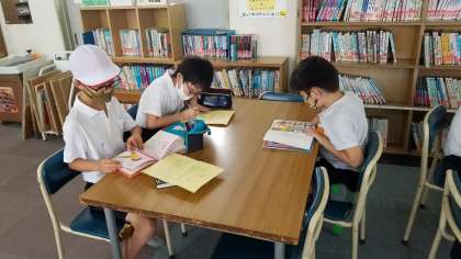図書館開放の様子です。今日は「暑さ指数」が厳重注意から危険となったので、運動場は使用禁止になりました。そのためたくさんの児童が図書館にきて本を読んでくれました。