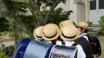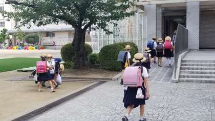 子どもたちが、弱って地面に落ちたセミを梅の木に戻していました。
