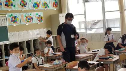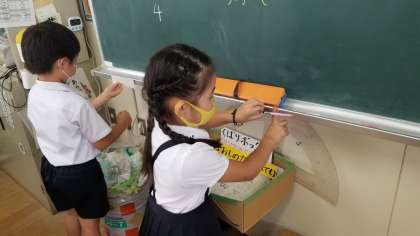 算数の様子です。めあては「ながさをくらべるほうほうをかんがえよう。」です。鉛筆や筆箱などで長さを測り、くらべていました。この授業は指導教諭やメンターの先生方等が参観・指導するメンター研修として行いました。