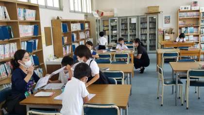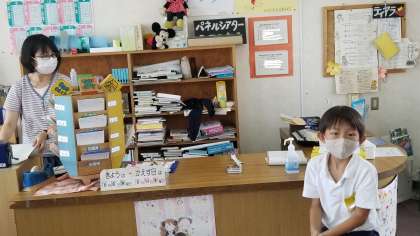 休み時間の図書館開放の様子です。毎週木曜日は図書館司書の先生に来てもらっています。本の分類等、子どもたちが本を選んだり、読みやすくしたりと、常に図書館の環境改善に努めてもらっています。