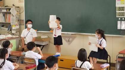 写真は1年生の様子です。1組は学級通信を確認していました。2組は夏休みの発表をしていました。