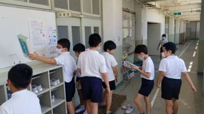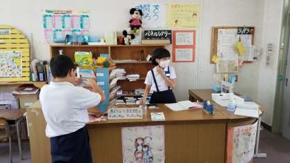 休み時間の図書館開放の様子です。図書館は今日も大人気です。開館の前から子どもたちが並んでいます。