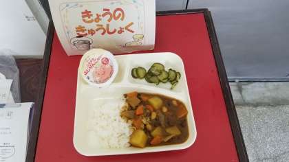 今日の給食は、牛肉と大豆のカレーライス、きゅうりのピクルス、りんごゼリー、牛乳です。しっかり食べましょう。