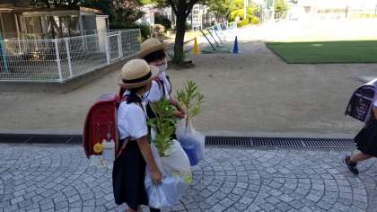 3年生は夏休みの間、家や学園で育てたほうせんかをもっての登校です。