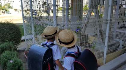 体育館前の朝顔の花を観察しています。水色の朝顔を見て、「この朝顔、色がうすい」等お話をしていました。