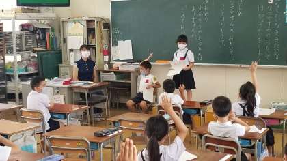 1年生は「夏休みの思い出」について発表しています。発表した後もたくさんの質問や意見がありました。