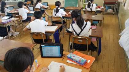 3年生は算数の様子です。「一万を10こ集めると十万、十万を10こ集めると百万」というように位が変わることをタブレットを活用して学習していました。
