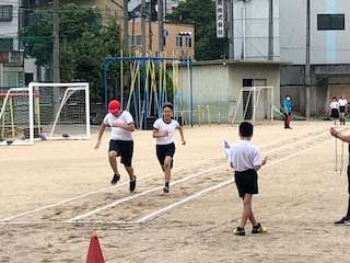 6年生の体力テストの様子です。50m走のタイムを計っています。