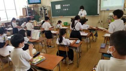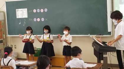 2年生の音楽の様子です。カスタネットやタンバリンでリズムを取りながら歌っていました。各グループの発表もしっかりとできていました。