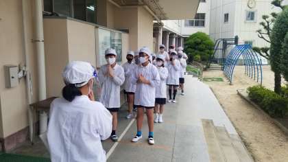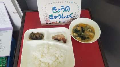 今日の給食は、鶏肉のてり焼き、みそ汁、なすのそぼろいため、ごはん、牛乳です。しっかり食べましょう。「いただきます。」
