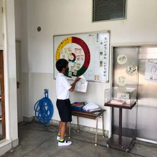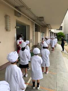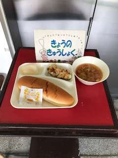 今日の献立は、豆腐マカロニグラタン、トマトスープ、なし、コッペパン、マーマレード、牛乳です。おいしくいただきました。給食委員会の子どもたちも頑張っていました。