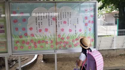 6年生の作った掲示物を登校してきた児童が眺めています。