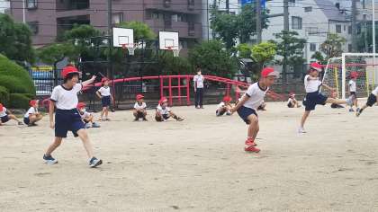 1年生の体育の様子です。運動場では、体つくり運動の「体を移動する運動遊び」の様子です。大きく足を前に出したり、後ろ向きに移動する等、いろいろな動きで興味を持って楽しく活動できていました。