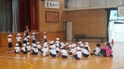 体育館では、運動会を控えて、集団行動の練習です。基準になるお友だちや、縦・横のお友だちを見て、しっかりと行動できていました。