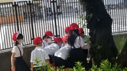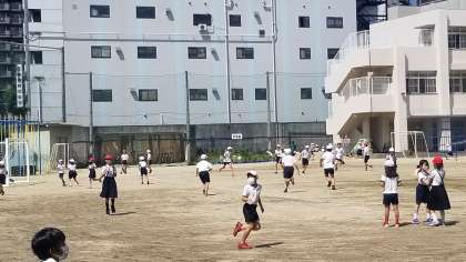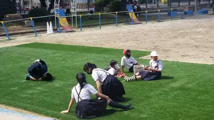 運動場の様子です。元気いっぱい遊んでいます。人工芝も気持ちよさそうです。天小広場では1年生が虫のすみかを見つけたようです。