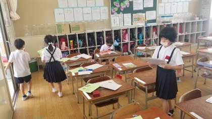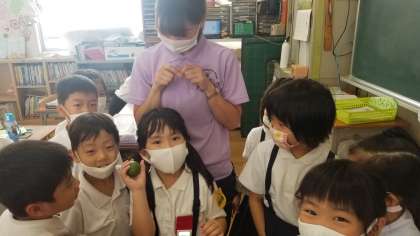 お友だちが、運動場南側でみかんの実を見つけてきました。「うわ、すごい。見せて。見せて。」と他のお友だちも集まってきました。
