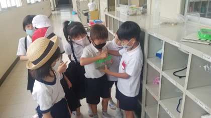 1年生が、バッタを捕まえて見せてくれました。