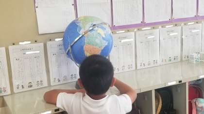 最近見かけなくなった地球儀を見ている児童がいました。いろいろな国を聞くと、地球儀を回してすぐに教えてくれました。