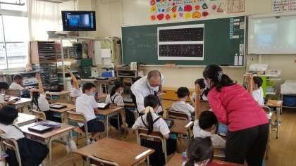 1組は双方向通信「Teams」の学習です。支援員の先生もいっしょに子どもたちの支援をしてもらいました。