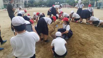 5年生の理科の様子です。流水の働きについて学習していました。砂山で水を流して実験をしていました。