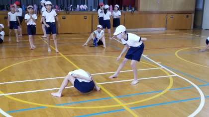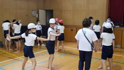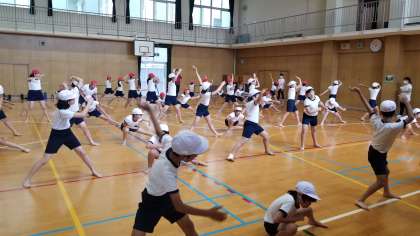 5・6年生が体育館で運動会の練習を行いました。休憩時間も互いに動作の確認をする等、気合が入ってきました。