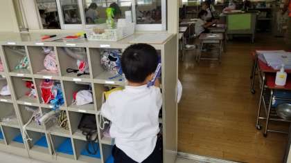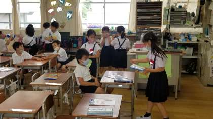 1年生の様子です。くばり係の児童がノートを配っています。せいり係の児童はみんなのロッカーをきれいに整理していました。一人一人がしっかりと役割を果たしています。
