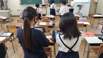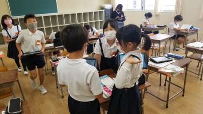 3年生の算数の様子です。 例えば、16×4の筆算の問題は、まず、6×4=24 次に、10×4=40 よって答えは24+40=64 というように、計算問題の答えを導き出す考え方をタブレットに書き込み、互いに確認しながら学習していました。