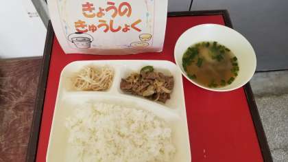今日の給食は、プルコギ、トック、もやしの甘酢あえ、ごはん、牛乳です。いただきます。