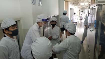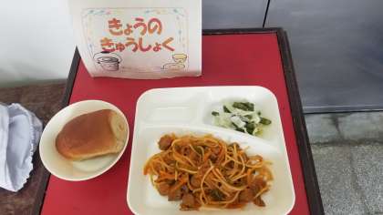 今日の給食は、イタリアンスパゲッティ、グリーンアスパラガスとキャベツのサラダ、パン、牛乳です。いただきます。