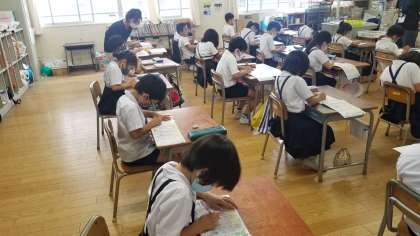 2年生の国語の様子です。漢字の学習をしていました。先生から上手に描くワンポイントアドバイスでしっかりと書いていました。どの児童も姿勢がいいですね。