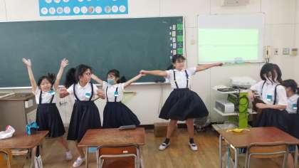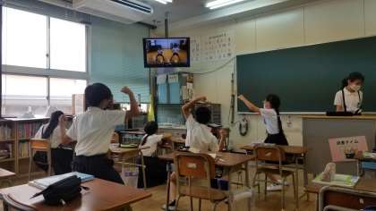 4年生の様子です。1組はビデオを観て応援団の練習をしていました。2組は団体演技の練習をしていました。