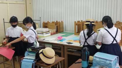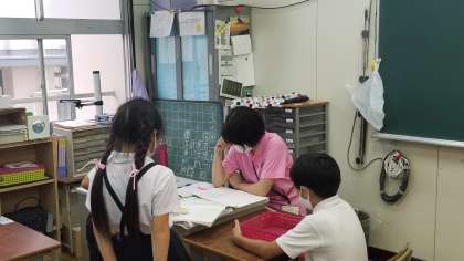 正門の掲示物を作成している児童や教室で担任の先生と自主学習している児童がいました。とてもよい雰囲気です。