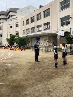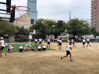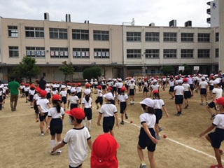 今朝は、運動会に向けての体育朝会がありました。登校した児童は、体育服に着替えて運動場で朝会が始まるのを待っていました。代表委員会の児童は、朝会の練習をしていました。運動会の開会式の並び方に並んで朝会が始まりました。
