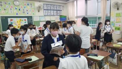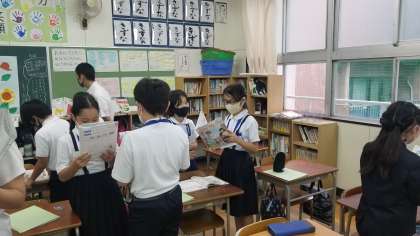 5年生の英語の様子です。「いつ何をするかをたずねたり答えたりする言い方を知ろう。」をめあてに、互いに会話をして学習しています。