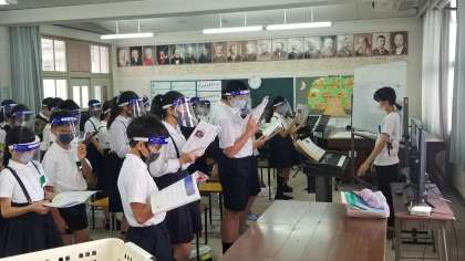 6年1組の音楽の様子です。フェースシールドをつけて、「星の世界」を歌っていました。