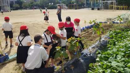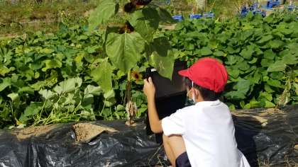 1年生のせいかつかの様子です。タブレットでひまわりの撮影をしていました。