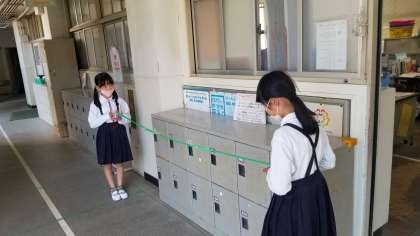 子どもたちが、職員室前で、「これで2m。廊下に貼ってあるテープと同じや。」と、フィジカルディスタンスを体感していました