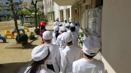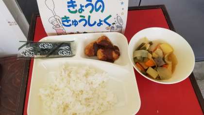 今日の給食は、みそカツ、じゃがいもと野菜の煮もの、焼きのり、ごはん、牛乳です。いただきます。