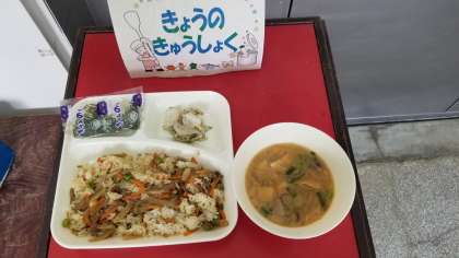 今日の給食は、牛肉のきんぴらちらし、みそ汁、キャベツの赤じそあえ、牛乳です。いただきます。
