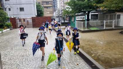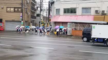 おはようございます。雨の中、子どもたちが笑顔で登校してきました。長靴だから水たまりも大丈夫です。