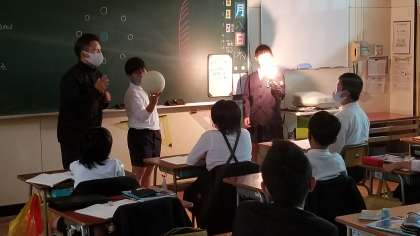 6年生の理科の様子です。月と太陽について学習していました。ライト(太陽)とボール(月)を使って、いろんな角度からボール(月)の見え方を確認していました。