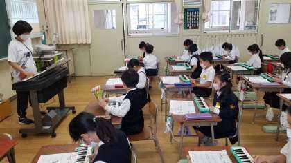 2年生の音楽の様子です。書画カメラを活用して、鍵盤ハーモニカの指使いについて学習していました。