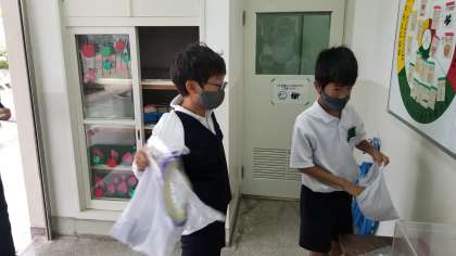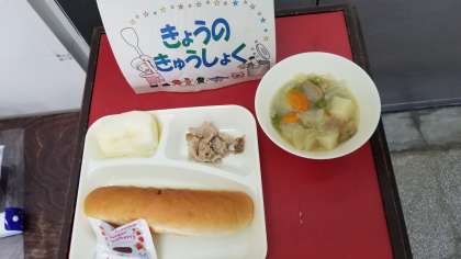 今日の給食は、鶏肉のガーリック焼き、豚肉と野菜のスープ煮、りんご、パン、牛乳です。いただきます。
