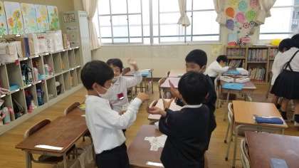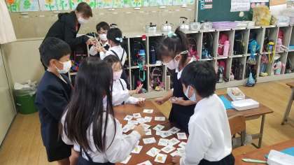 1年生の様子です。雨なので教室でカードゲームをしていました。