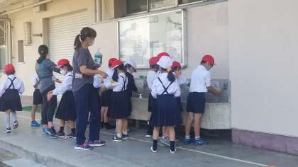 1年生が教室に戻る前に手洗いをしていました。