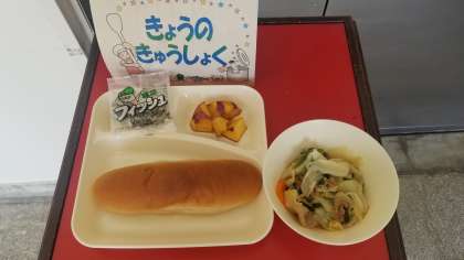 今日の給食は、豚肉といかの中華煮、大学いも、ミニフィッシュ、パン、牛乳です。いただきます。