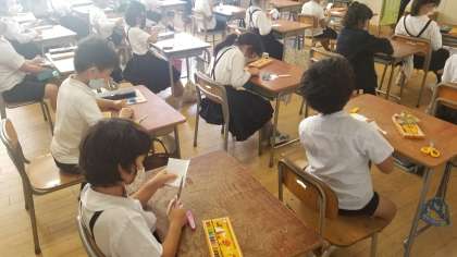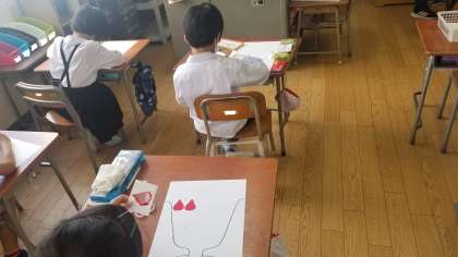 2年生の図工の様子です。「おいしいパフェをつくろう。」です。画用紙で型紙をつくり、かたぬりこみやうちぼかしの画法でフルーツやプリン等を描きパフェを作ります。おいしいパフェができるか楽しみです。