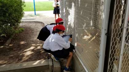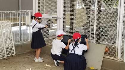 1年生の様子です。せいかつかで、「いきものとなかよくなろう」です。タブレットでうさぎの「マロン」を撮影していました。変化や成長を観察して、生き物に親しみ、生き物を大切にする心を育てます。